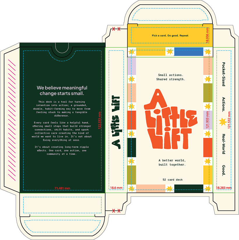 This deck is a tool for turning intention into action; a grounded, doable, habit-forming way to move from feeling stuck to making a tangible difference.