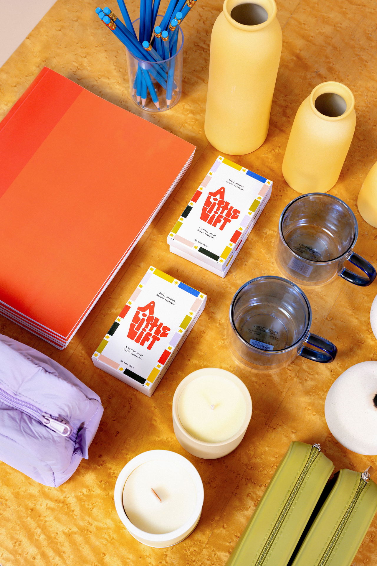You'll find greeting cards, vinyl stickers, bookmarks, and gel pens, alongside A Little Lift: a 50-card action deck for turning overwhelm into real world good.